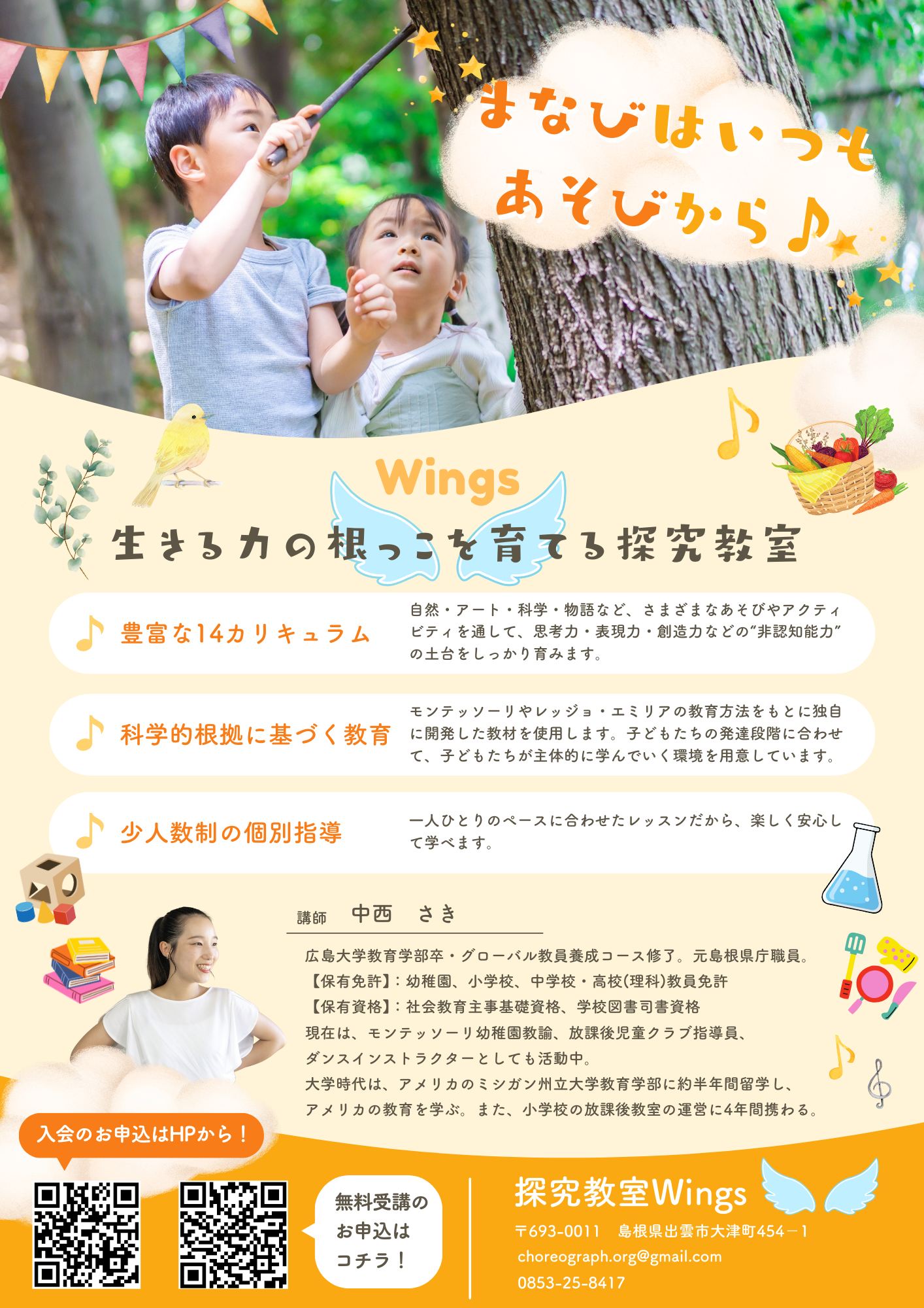 探究教室Wingsは、「あそびながら学ぶ」をモットーに、子どもたちが五感をフルに使ってのびのびと探究できる環境を用意しております。