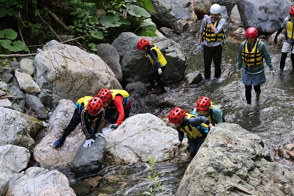 ぶとともに、協力して沢の段差を乗り越えていくことを通して、達成感を感じたり、体力向上につな